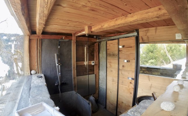 salle de douche du Mazot de l’Ours Publié 28 mars 2020 à 3433 × 2127 Une salle de douche et toilettes, vous aurez le plaisir de vous doucher comme en pleine nature et face au Mont-Blanc grâce à la grande baie vitrée.